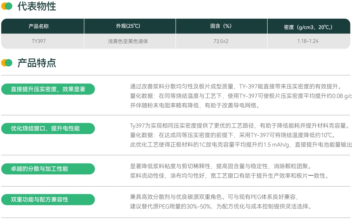 分散剂TY397是一款专为磷酸铁锂(LFP)正极材料研发的高性能分散剂,核心成分为特殊结构的磷酸酯化合物。本品可部分替代传统PEG,在发挥高效分散与碳源功能的同时,其核心价值在于能显著且量化地提升极片压实密度或优化烧结工艺,从而直接提升电池的体积能量密度与倍率性能。