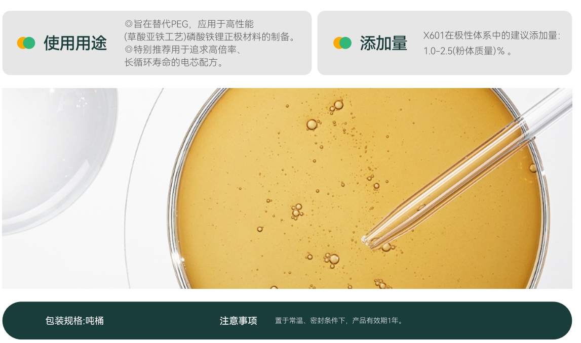 分散剂X601是一款基于特种有机磷酸酯技术的创新产品,旨在解决传统分散剂(如PEG)在性能上的局限。它不仅在磷酸铁锂的溶剂基(草酸亚铁)工艺中提供卓越的分散降粘效果,更能在高温烧结后通过其独特的"碳-磷"协同效应,在颗粒间构建优异导电网络,并显著提升电极材料的压实密度,是实现更高能量密度和倍率性能的理想选择。