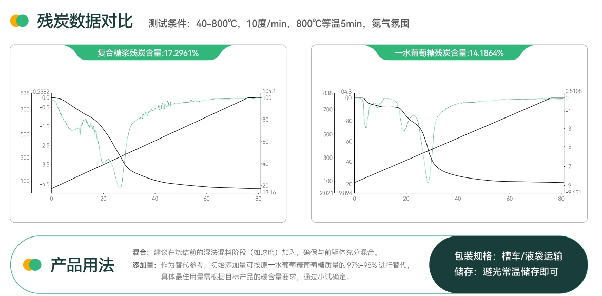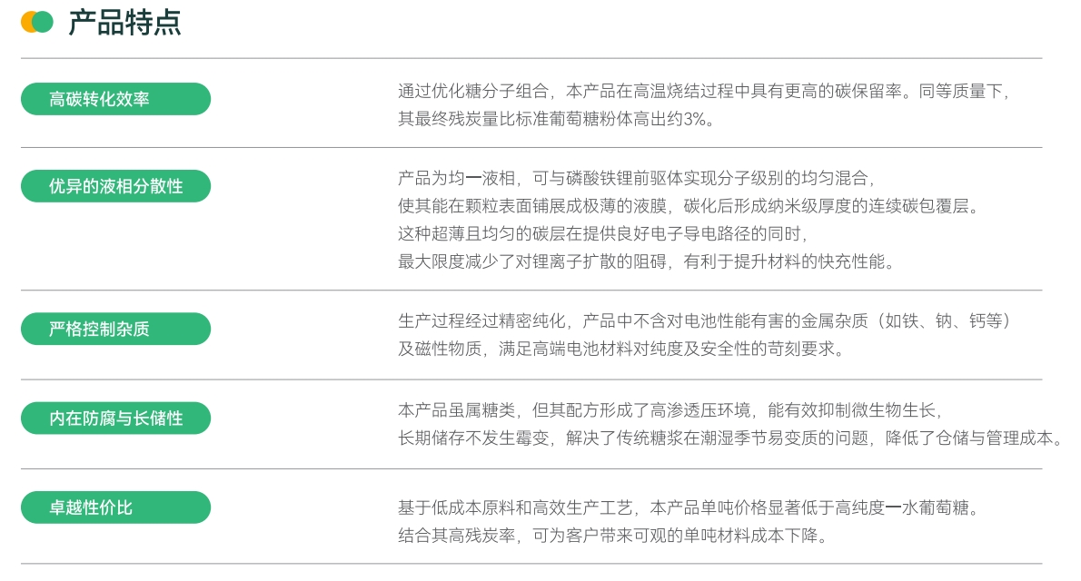复合糖浆是一款为新一代高性能磷酸铁锂正极材料量身定制的新型液态碳源。它旨在系统性解决传统固体碳源(如一水葡萄糖)在应用过程中存在的包覆均匀性差、残炭率不稳定、工艺粉尘大及成本高等核心痛点。本产品基于对单糖形成更有序、均匀碳层机制的深入理解,通过科学复配与工艺优化,实现了碳源形态与性能的突破,为制备高压实密度、高倍率、长循环寿命的磷酸铁锂材料提供了理想的解决方案。