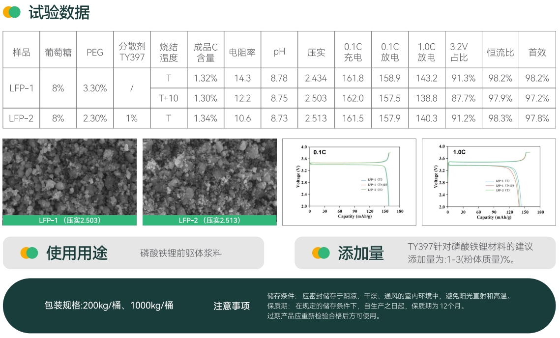 分散剂TY397是一款专为磷酸铁锂(LFP)正极材料研发的高性能分散剂,核心成分为特殊结构的磷酸酯化合物。本品可部分替代传统PEG,在发挥高效分散与碳源功能的同时,其核心价值在于能显著且量化地提升极片压实密度或优化烧结工艺,从而直接提升电池的体积能量密度与倍率性能。