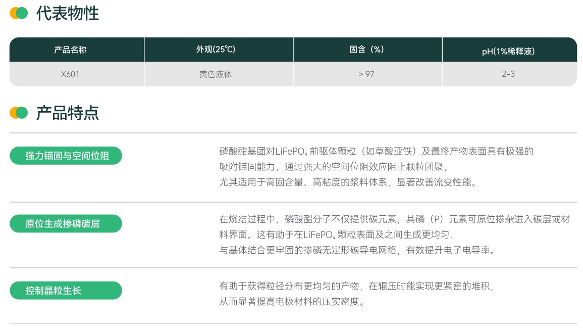 分散剂X601是一款基于特种有机磷酸酯技术的创新产品,旨在解决传统分散剂(如PEG)在性能上的局限。它不仅在磷酸铁锂的溶剂基(草酸亚铁)工艺中提供卓越的分散降粘效果,更能在高温烧结后通过其独特的"碳-磷"协同效应,在颗粒间构建优异导电网络,并显著提升电极材料的压实密度,是实现更高能量密度和倍率性能的理想选择。